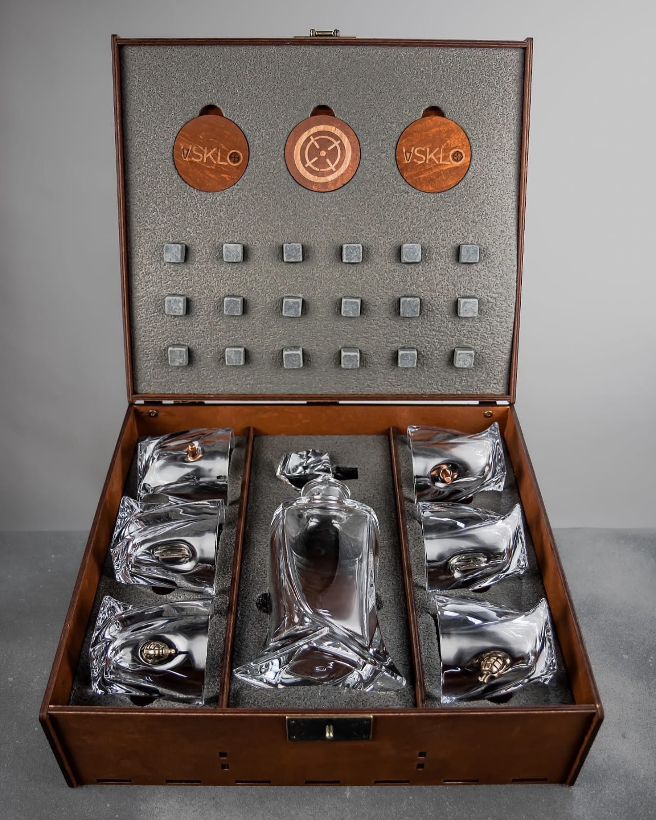 Este set organiza la barra con presencia y oficio. Una maleta de madera de formato amplio aloja seis vasos de cristal grueso intervenidos con insertos metálicos (combinación bala y escudo), montados y centrados a mano. La tapa integra 18 piedras de enfriado y seis posavasos ; el interior de espuma moldeada mantiene cada pieza firme. Producción mendocina, materiales sólidos y verificación pieza por pieza.