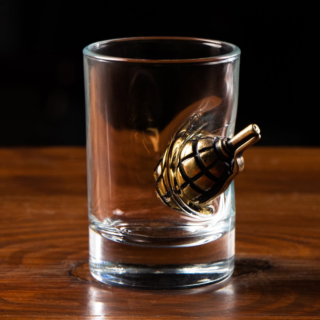 6 vasos con figuras metálicas (bala, granada, insignia), montadas y centradas a mano