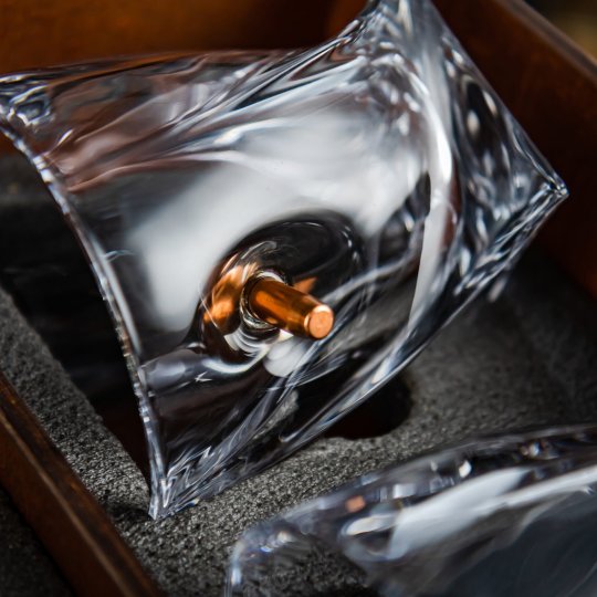 Los vasos y decanters son de vidrio/cristal de alta claridad. Los insertos (bala, granada, escudo, cereza, moneda, etc.) se fabrican en aleación metálica y se fijan de forma mecánica y sellada; cada pieza se centra y revisa manualmente.