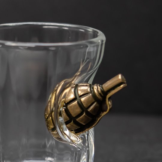 Los vasos y decanters son de vidrio/cristal de alta claridad. Los insertos (bala, granada, escudo, cereza, moneda, etc.) se fabrican en aleación metálica y se fijan de forma mecánica y sellada; cada pieza se centra y revisa manualmente.